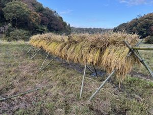 今回は稲刈り・はざかけの実習で快晴の下、みんなで楽しく行うことができました。前回準備した竹たちの組み立てから始まりました。八の字、逆八の字を繰り返しながら竹を地面に打ち、両端に倒れないように補助の竹を打ちました。組み立ては全て先生に行っていただきました。トンカチで竹を打ち、はざかけの高さを合わせるのは熟練の技だと感じました。できたはざかけの長さは10m。ぶら下がっても頑丈でした。