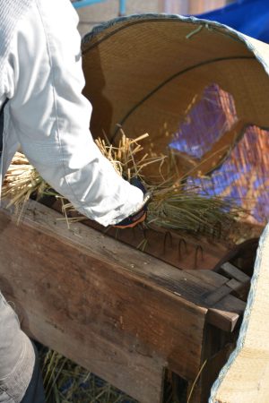 今回使用したのは足踏み脱穀機とクリーントーミです。足踏み脱穀機は金具のついた円筒とそれを回転させる足踏み板で構成されています。板をリズム良く踏むことで円筒が回転し、金具で籾を絡み取る仕組みになっています。籾が周囲に飛ばないようにビニールシートやすだれで機械を覆いました。脱穀した籾の量は30㎏の米袋が2袋分。板を踏むのが相当重く、翌日は脚の筋肉痛と腰痛に悩まされました…