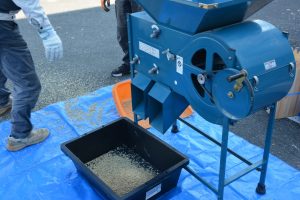 脱穀すると籾だけでなく稲わらや籾殻も多く混じります。次に活躍するのがクリーントーミです。ハンドルを回して風を起こし、稲わらやもみ殻を奥の吐き出し口から出す仕組みになります。投入する籾の量は限られているので数回に分けてやっていきます。ハンドルを回し続けるのも一苦労でした。