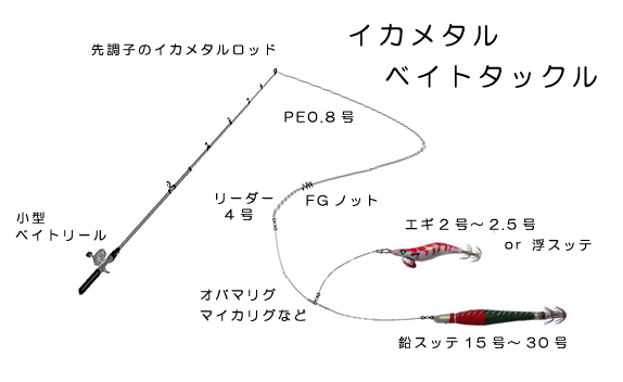 仕掛けはエギという疑似餌を2つ使うイカメタルという釣り方をします。